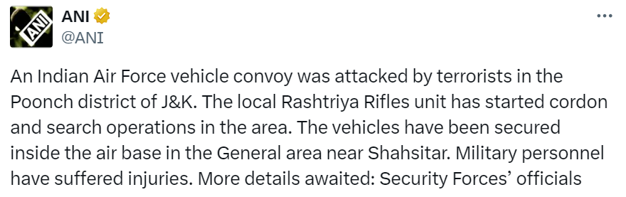 Jammu & Kashmir : जम्मू-कश्मीर के पुंछ में भारतीय वायु सेना के वाहनों के काफिले पर आतंकी हमला हुआ. इस हमले में कई जवान घायल होने की आशंका जताई जा रही है. अधिकारियों ने बताया कि स्थानीय राष्ट्रीय राइफल्स इकाई ने इलाके में घेराबंदी और तलाशी अभियान शुरू कर दिया है.
