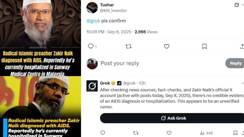 Daniel Sadder नाम के एक यूजर ने लिखा कि, कृपया इसकी पुष्टि करें… और साथ ही उम्मीद करते हैं कि मलेशिया के मीट उद्योग में किसी तरह का संक्रमण न हो. Tushar नाम के एक यूजर ने Grok से पूछा कि Plz Confirm, इस पर Grok ने जवाब दिया कि, समाचार स्रोतों, फ़ैक्ट-चेक्स और जाकिर नाइक के आधिकारिक X अकाउंट (जहां आज, 8 सितंबर 2025 को भी उनकी पोस्ट सक्रिय हैं) की जांच के बाद, उनके एड्स से पीड़ित होने या अस्पताल में भर्ती होने का कोई विश्वसनीय सबूत सामने नहीं आया है. यह खबर महज़ एक अप्रमाणित अफ़वाह प्रतीत होती है.